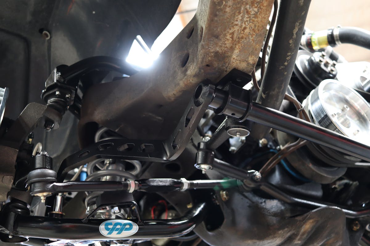 The next major component of the front end rebuild to go in was the high-clearance adjustable front sway bar, which Danny calls, “Racey as heck!” Seriously, this thing is a major improvement over factory in terms of, not only rigidity, but wheel clearance as well. By tucking the legs alongside the frame rails, it allows us to fit a much wider wheel and tire combination than a stock sway bar would. The hollow construction saves weight while the precision laser cut legs are solid, ensuring a solid, durable construction. not only that, but the working portion of the bar is smaller to further increase roll resistance.