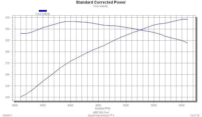 BPE 306 Ford This is what we like to see in a hot street motor, not just plenty of peak power but a ton of torque. With over 350 lb-ft from 3,500 rpm to 5,200 rpm, the little Windsor offered a broad curve, with ample torque production, even down low. Part of the credit goes to our selection of the dual-plane intake, but the heads and cam certainly played their part. The static compression ratio of 9.5:1 meant this combination would also readily accept assistance from a power adder.