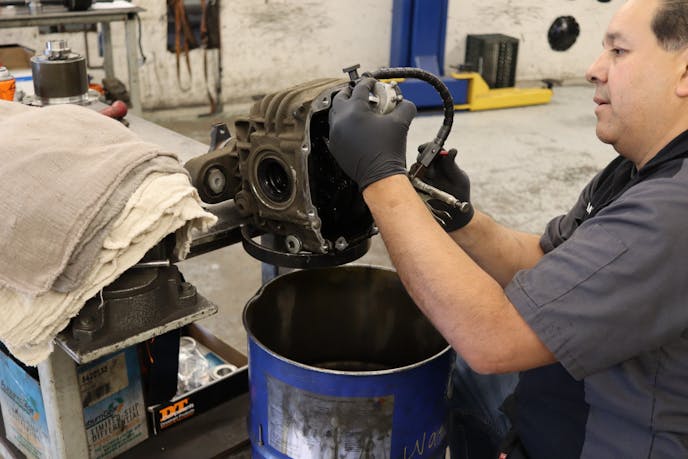 With the Daily Camaro on the lift, we began the rearend overhaul by removing the exhaust and driveshaft. With those things out of the way, we were afforded unimpeded access to the rearend, but not before removing the rear wheels. We also took this time to drain the differential of its ancient fluid – probably not serviced since its initial fill.