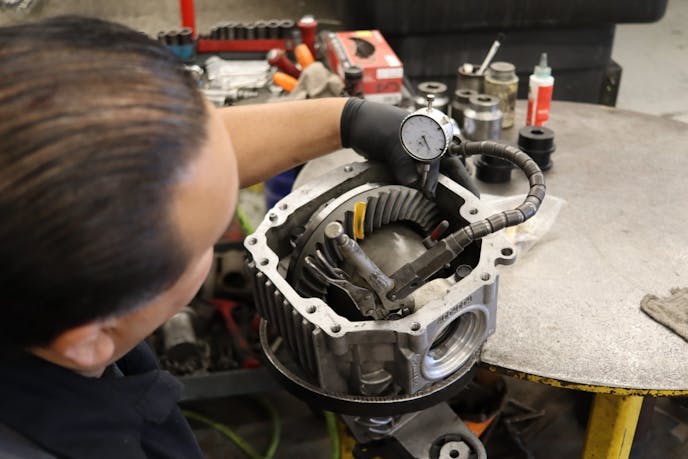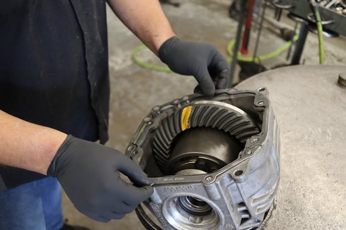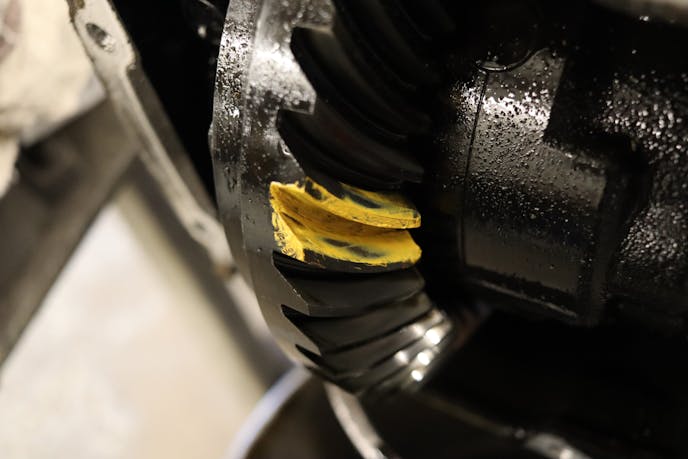 Next, David pressed the ring gear on the Truetrac which allowed him to set the carrier and gear in place using the original factory shims. The wear pattern on the gears indicated that the shim was correct and the backlash was appropriate.