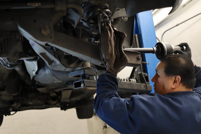 We slid the beefy new axles into the housing and then reattached the rear spindles. There was some slight difficulty lining up the splines of the axles while also lining up the control arm bolt holes, but after a few minutes, we had it back together. We wrapped up by bolting on the brake calipers and throwing the wheels back on.