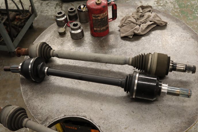 We removed the calipers and set them to the side so we could pull the axles out, but not before removing the driveshaft.