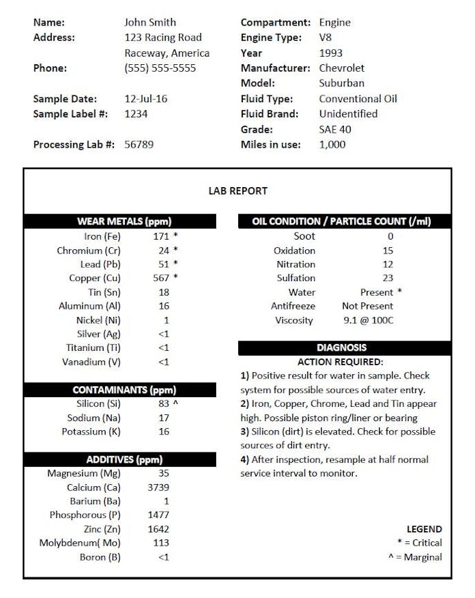 This sample used oil analysis report is representative of what you may receive back from the lab. Look for line items that are marked as being at marginal and critical levels, as well as any analyst comments. This data can be useful in determining whether to select a different oil, change your maintenance schedule, or if you have an internal engine problem that needs addressed.
