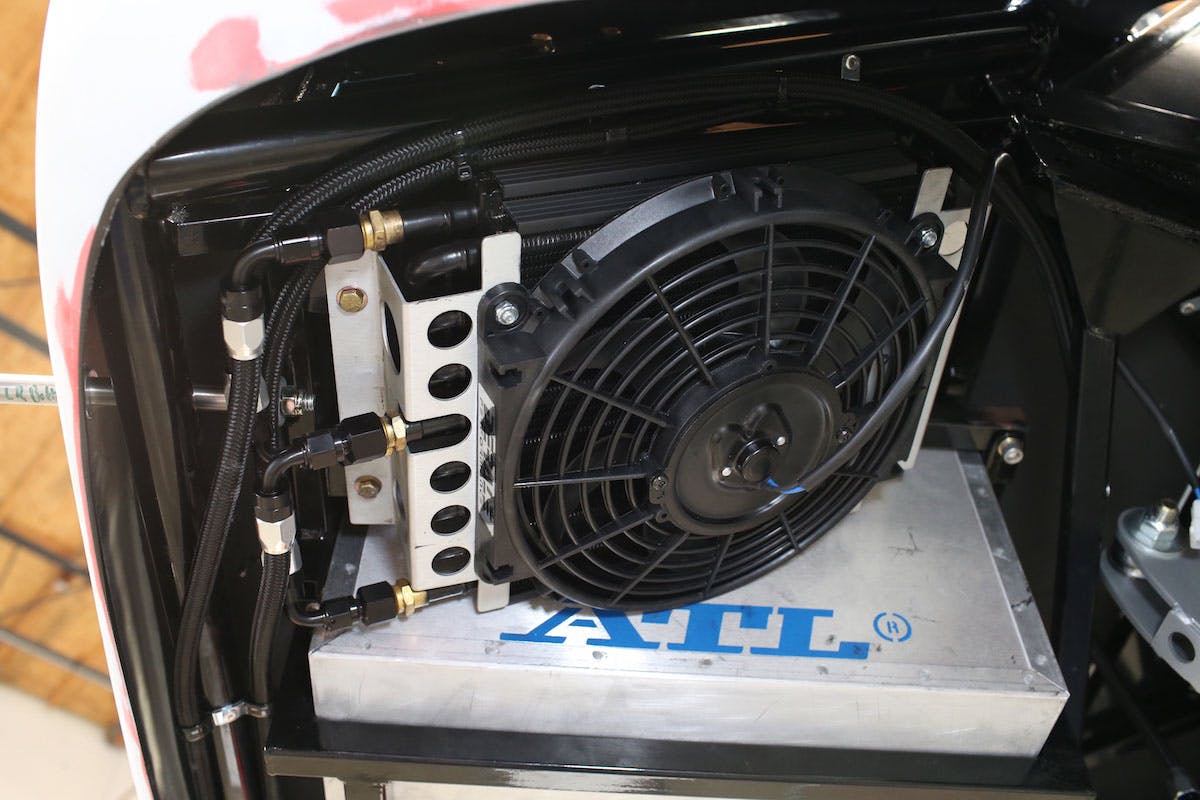 We had some space on the sides of the fuel cell and choose to mount the Tilton pumps on the left side with the Derale cooler on the right, not only to tuck the components safely away, but also to even out the load a bit.