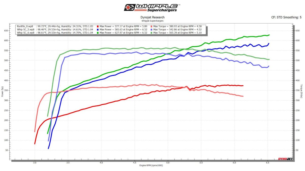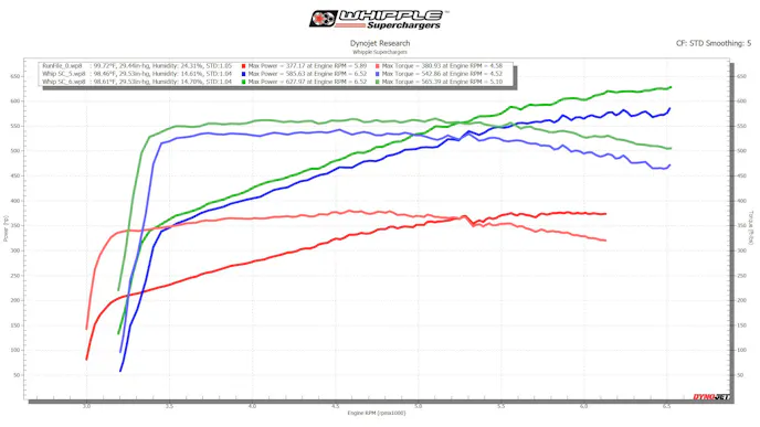 After bolting on the new blower, installing the heat exchanger, handling the airbox mod, connecting all of the necessary sensors, and bolting our front bumper, fender liners, and wheels back on, we were ready to handle things on the Dyno once more to see how much power our new Whipple supercharger afforded us.