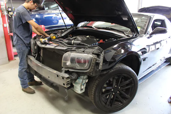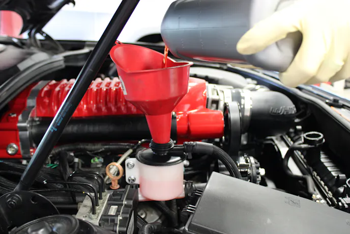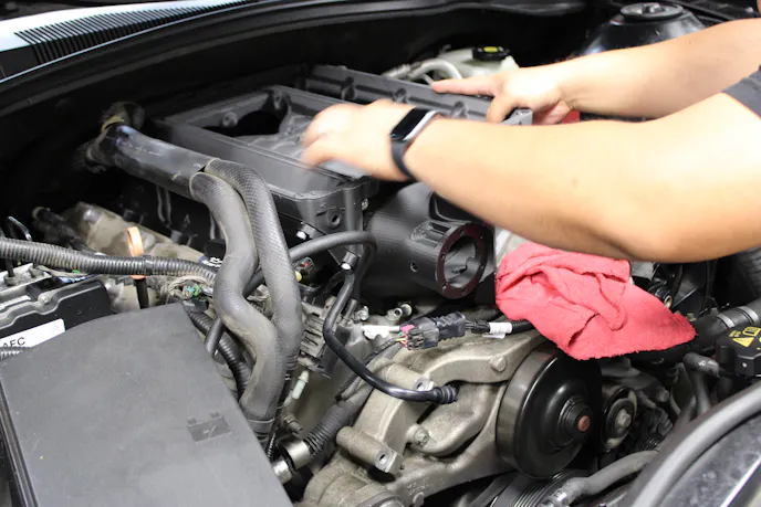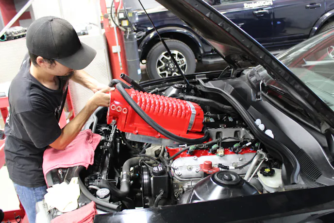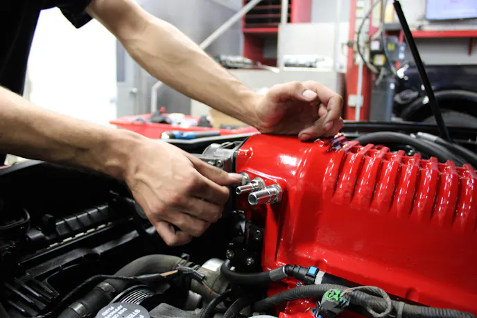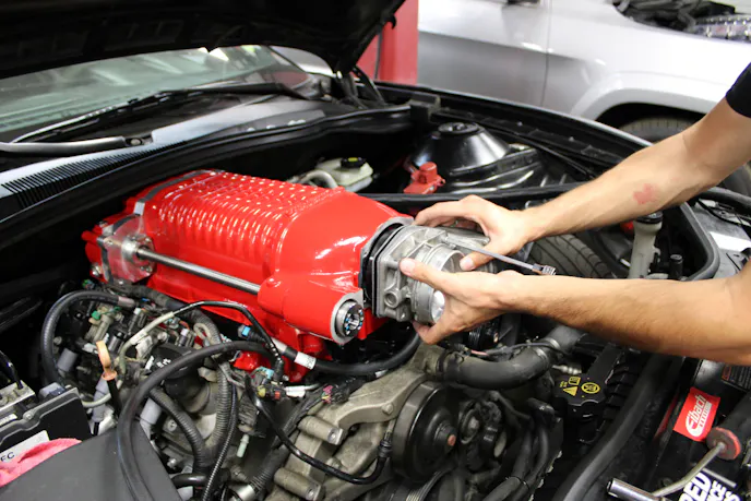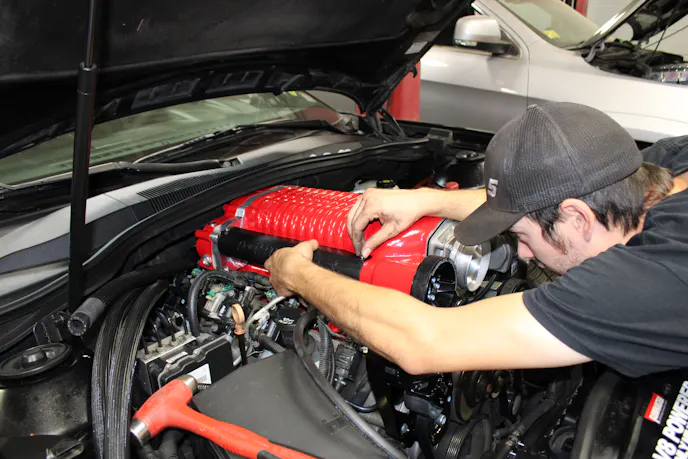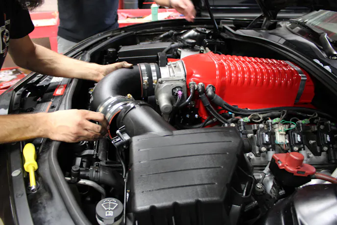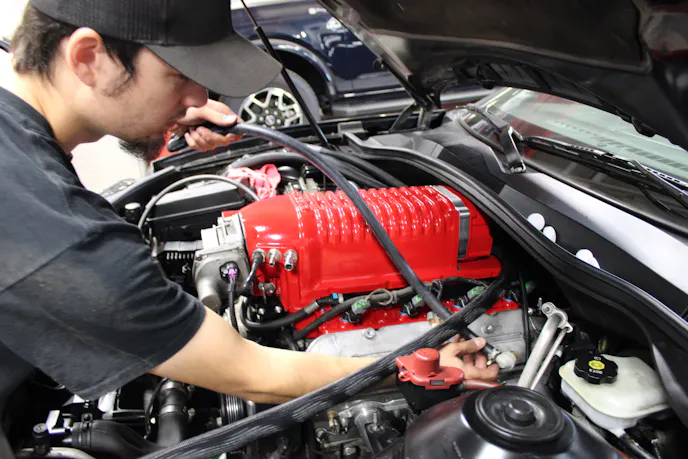 Once the supercharger was bolted on, we began connecting the brake vacuum check valve, purge hose, and throttle body. We also connected our fuel line and adjusted the vacuum actuator.
