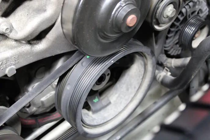 To prevent the harmonic balancer pulley from spinning on the crank due to the added force it will be subjected to, we needed to drill and pin the crank pulley.