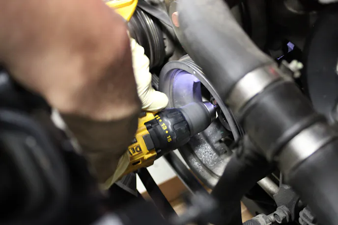 We began by removing the factory crankshaft pulley bolt. Luckily, we didn’t need to apply any heat to the bolt to get it out, although, that is a method Whipple recommends utilizing in the event of a stubborn fastener.