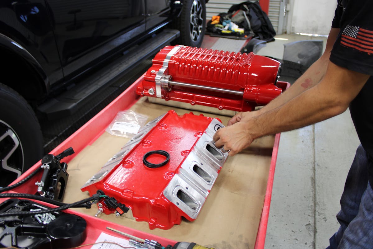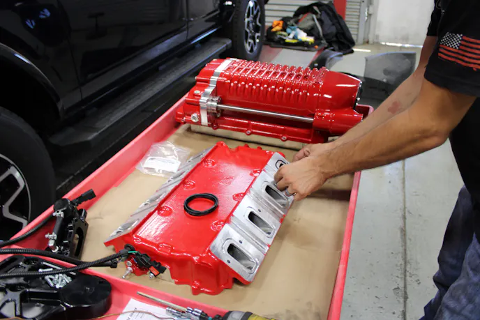 After that, it was as simple as following the torque sequence while securing the new fasteners. Then we were able to bolt the supercharger on, but not before filling it with oil. It did involve a tricky process of setting the supercharger assembly on the front of the manifold and attaching the cooler lines, but that was accomplished with the help of an assistant which made it much easier.