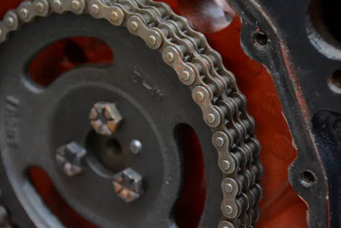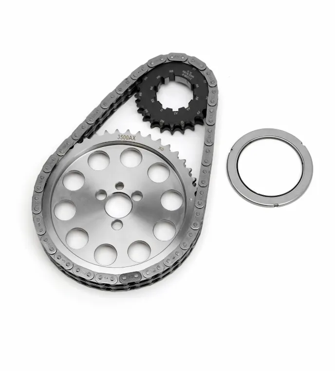 The factory link-belt chains were flat stacks of alternating metal links that fit on a sprocket set. While strong enough for racing, the hinged ends of flat metal created a lot of friction. They were replaced by “roller” chains featuring a bushing on an axle for each side of the chain link – very similar to a bicycle chain. Single row chains worked well for factory horsepower, but soon led to a “double row” design aimed at reducing friction and increased durability with higher valve spring and rpm demands of higher performance.