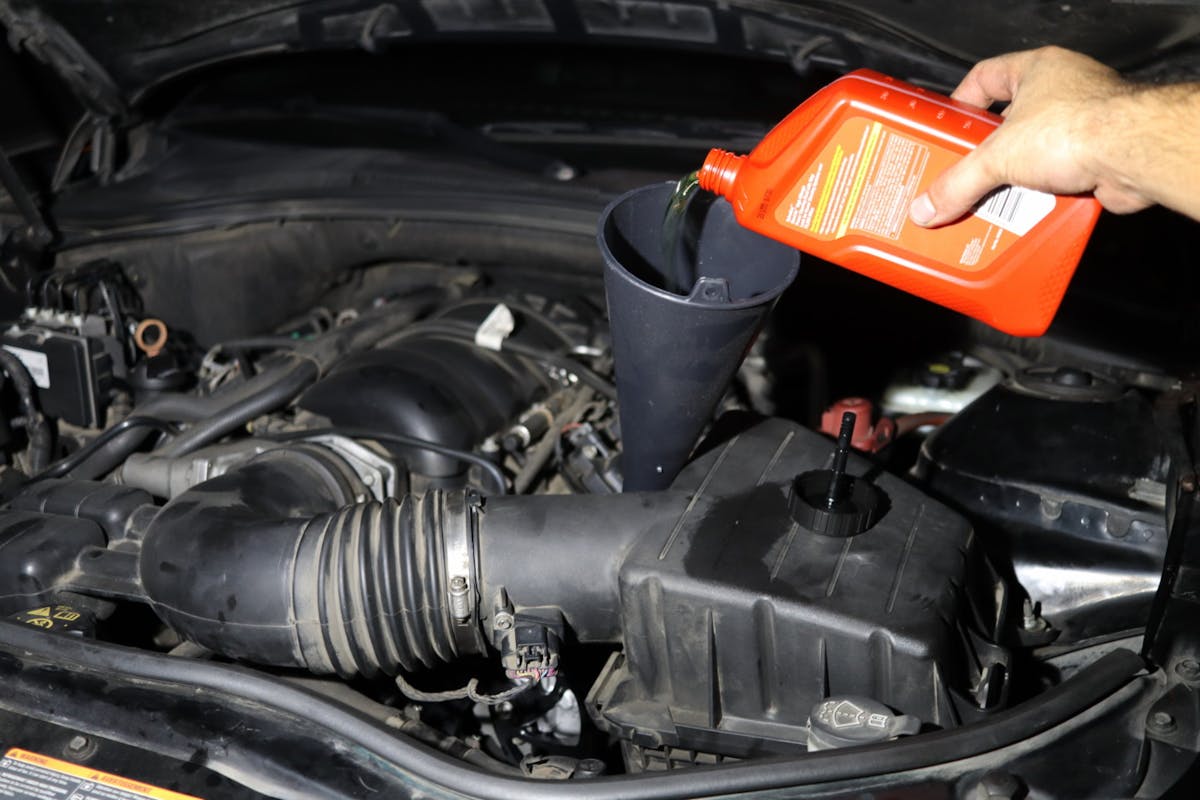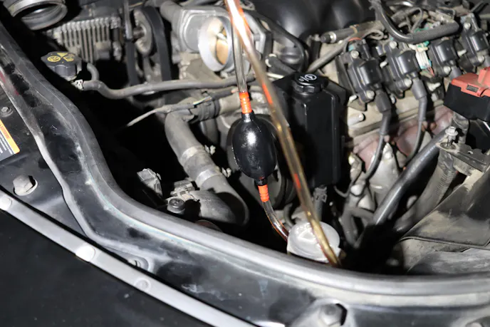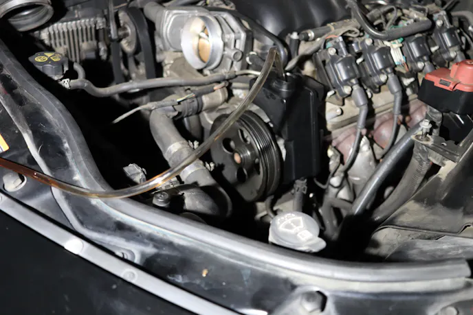 Before we could remove the power steering pump, we needed to siphon as much of the power steering fluid out as we could. Once that was done, we disconnected the high-pressure and low-pressure power steering lines from the bottom of the reservoir. We found a pair of channel locks worked best for the low-pressure clamp, and a flare wrench was fine for the high-pressure line.