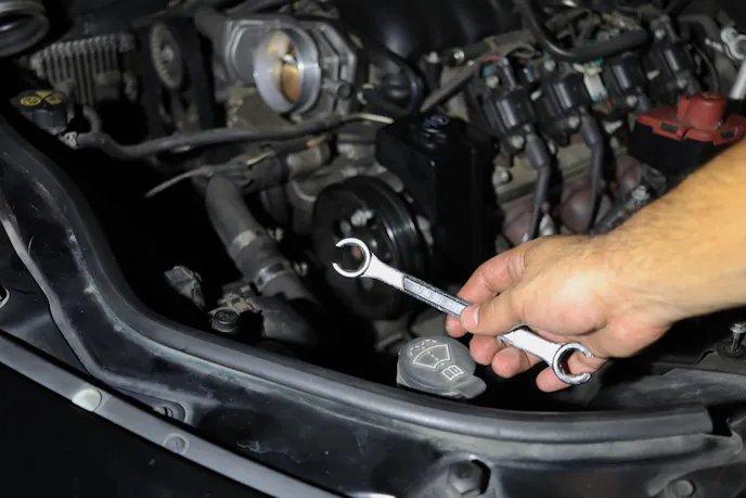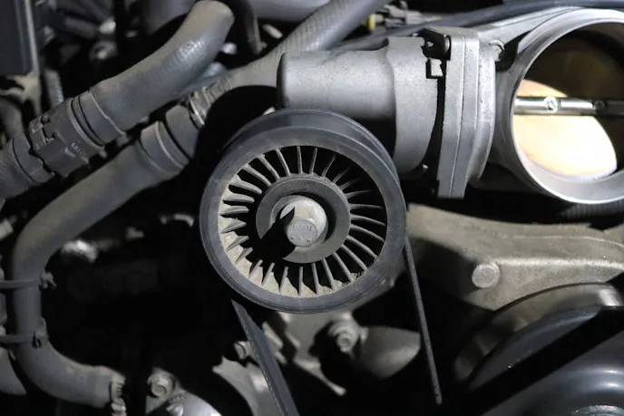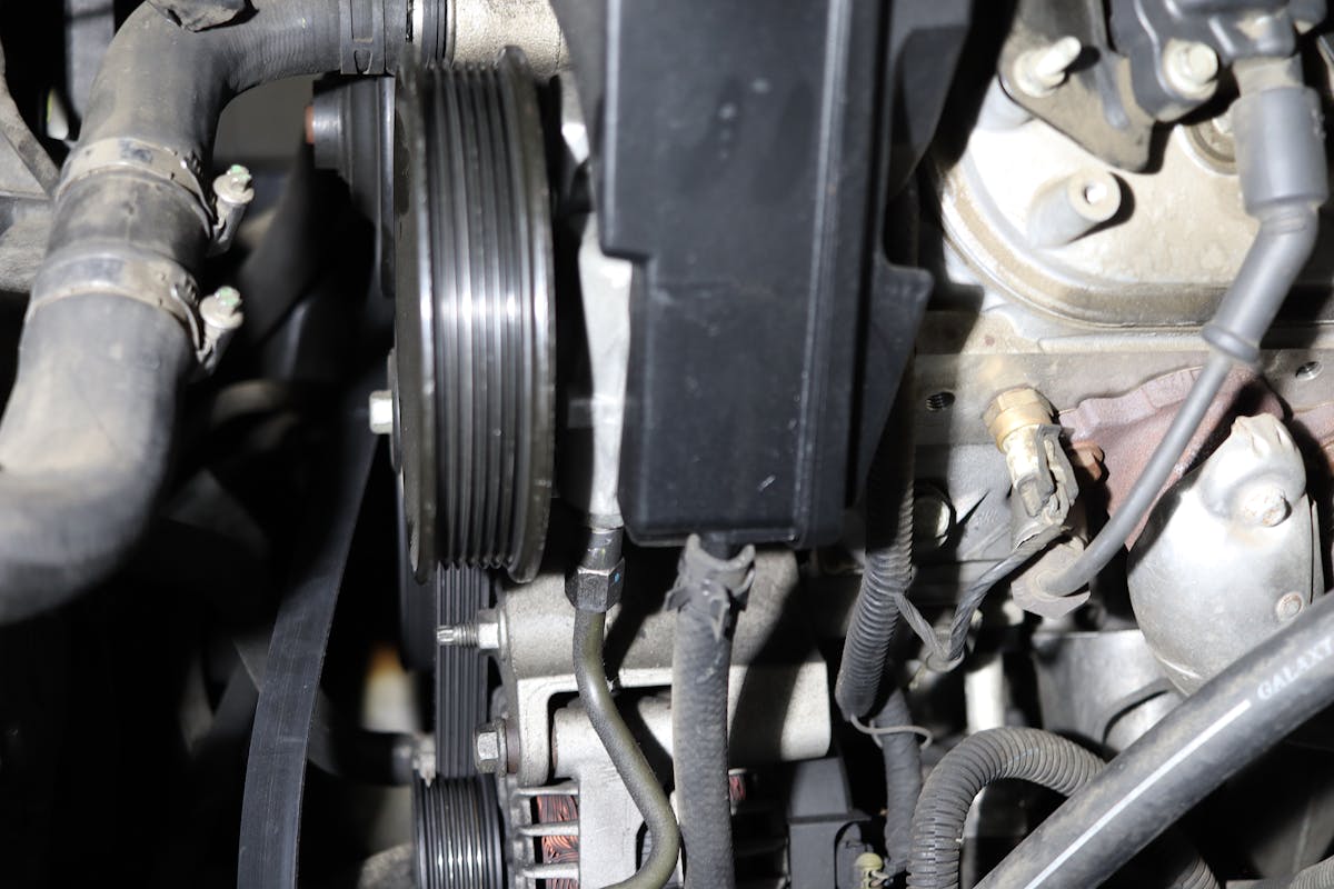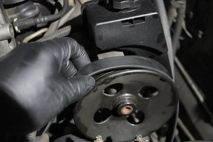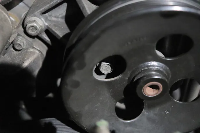 With the lines disconnected, we removed the serpentine belt from the pulley by rotating the belt tensioner to create slack. We made sure to take photos of the orientation of the belt so we could route it the same way on reassembly. Once the pulley was rotating freely, we could access the three 9/16-inch bolts attaching the pump to its mounting bracket.