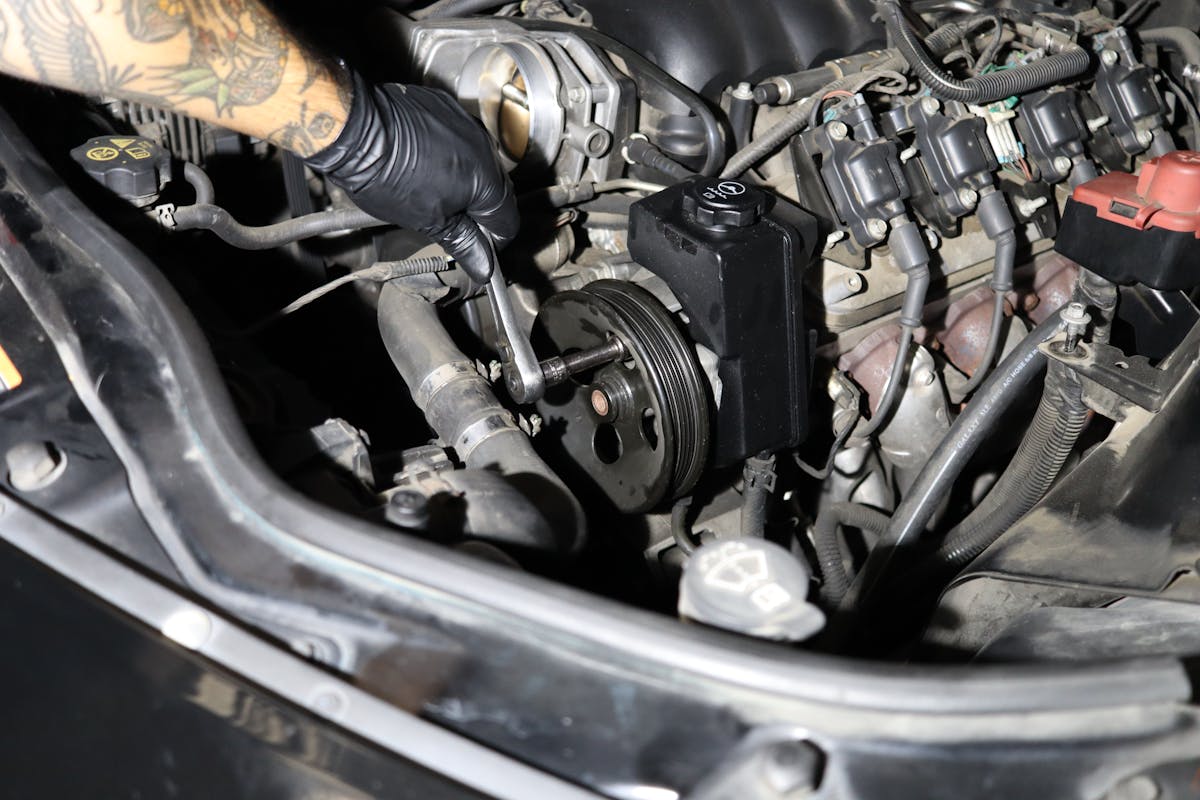 We began by bolting our new pump to the existing bracket which was still attached to the engine. The larger holes in the TurnOne anodized aluminum pulley made it much easier to access the bolts and line up the pump with the bracket. We then attached the high-pressure and low-pressure power steering lines using the same flare wrench and channel locks to do so. Creating slack in the serpentine belt using the belt tensioner allowed us to place the belt in the pulley’s grooves.