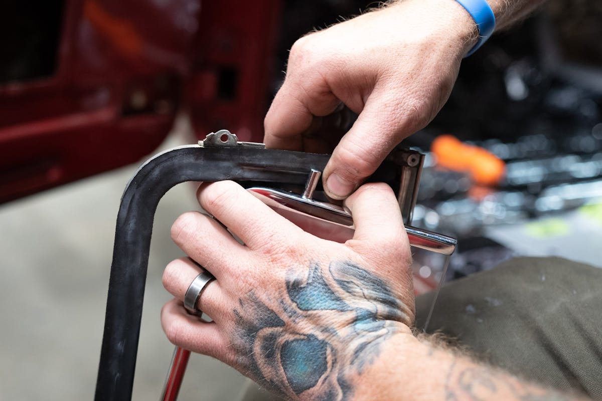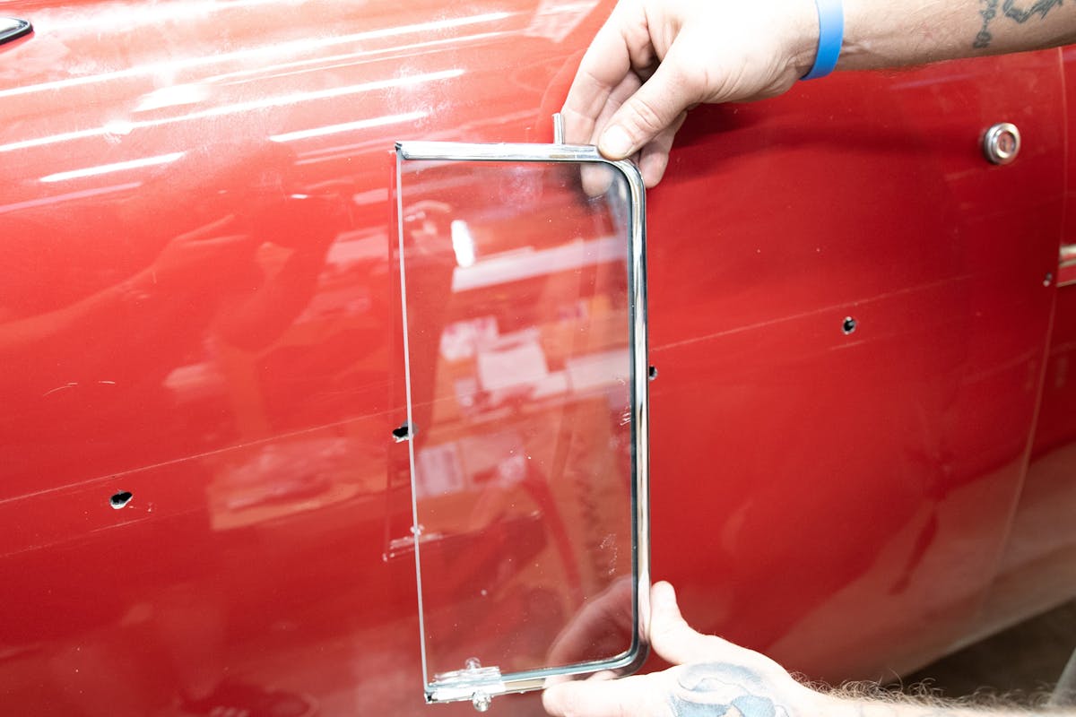 The top post of the vent window glass slides up into the top portion of the frame assembly, and the longer, bottom post mounts into the vent window regulator. You need to make sure that the top post goes through the rubber seal properly so that the window will operate as it should. Once the windows are closed, and the latch assemblies are secure, you should have a quiet and dry driving environment for your next trek to the show field!