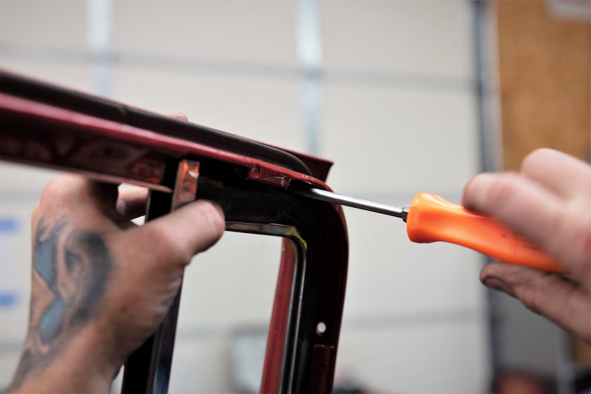 Once the vent windows are out, it’s easy to see how the assembly comes together. Of course, new seals came with our new glass. Aubrey informed us that the old, factory vent windows were prone to leaking and had a lot of wind noise. He was happy with the fit of the new seals, so this should be but a distant memory.