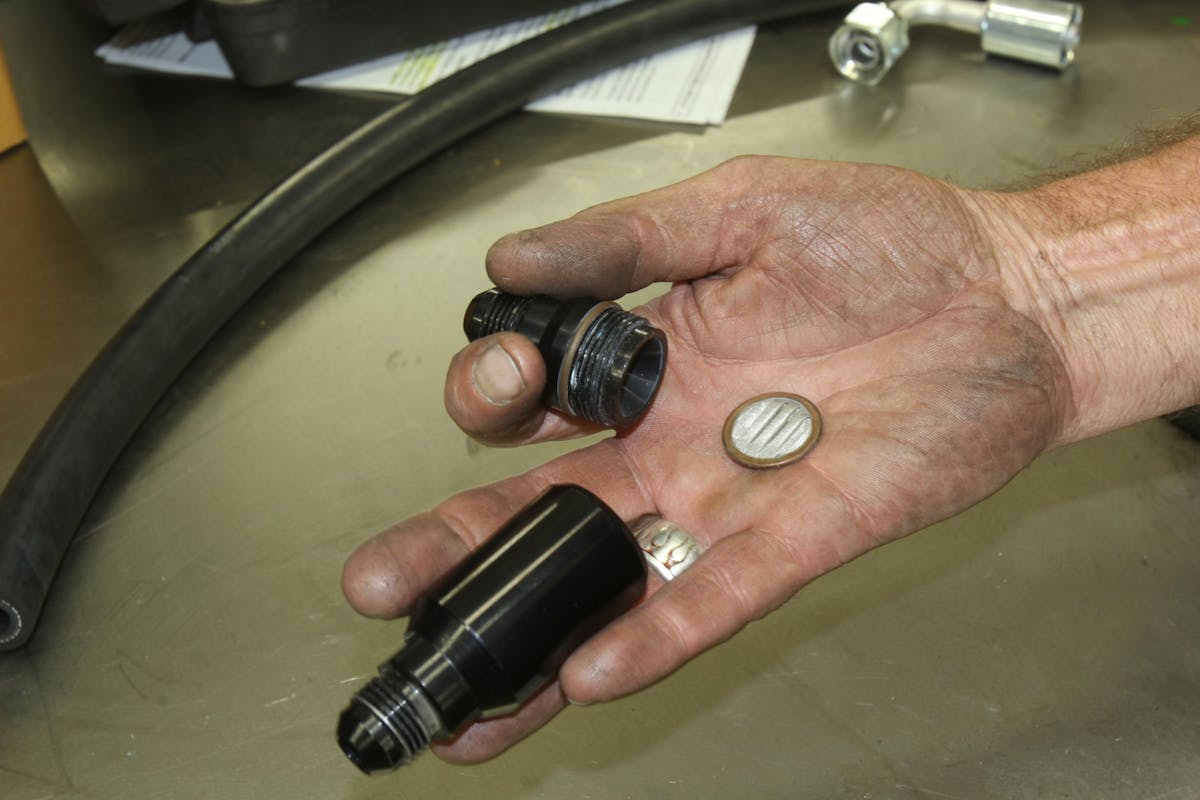 The car was originally built by a different shop and my friend was tasked with the job of making the new EFI engine fit in the Chevelle. During disassembly of the 540’s fuel system, he realized he had not found the fuel filter. Closer examination revealed the original builder had used an extremely small disc-style fuel filter with a filter area roughly the size of a half-dollar coin. When he disassembled the filter, he discovered it was nearly plugged with debris from the fuel tank, allowing only a small amount of fuel to pass through.