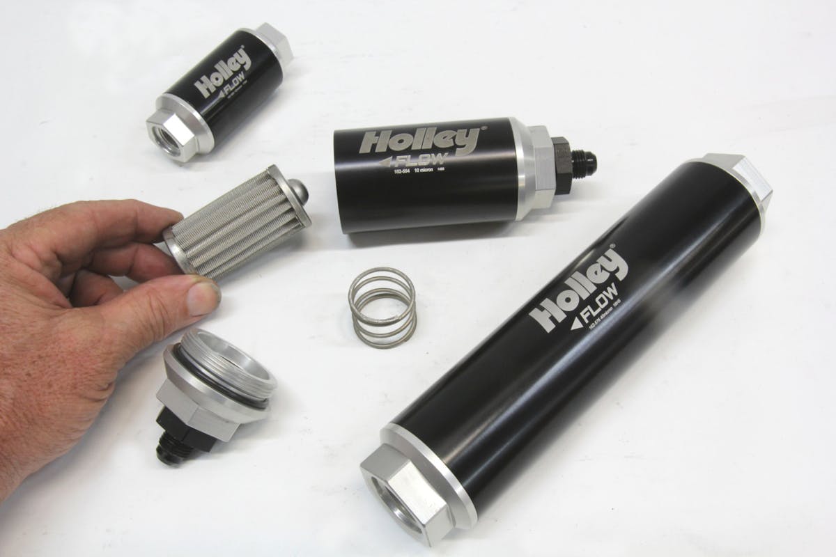 Several companies like Holley, Aeromotive, Earl’s, and others make different sized fuel filters with removable filter cartridges. Some, like this Holley filter, are stainless steel and can be cleaned and reused.