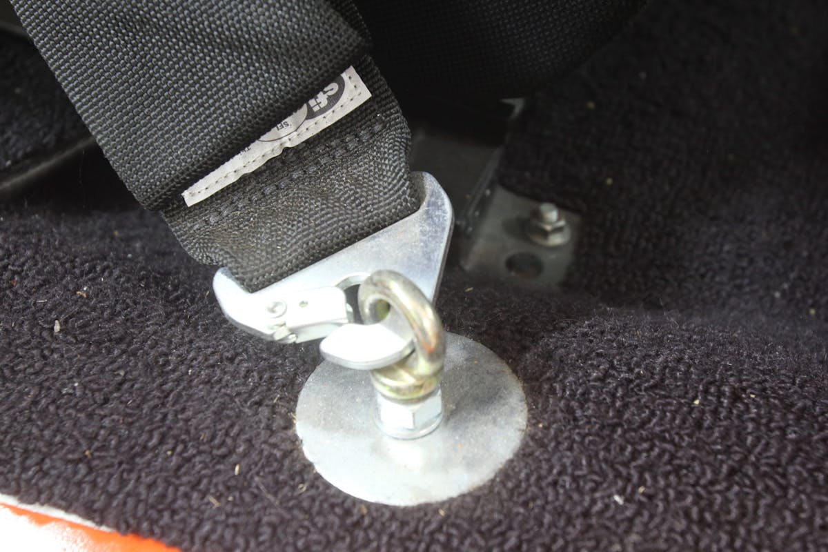 In a related point about the actual lap belt, among attachment options is this hoop style harness connection rather than bolting the triangle shaped metal ring flat on the floor. This arrangement aligns the belt to the driver position and note that the ring is oriented in the direction of the stress to prevent the ring from rotating under load.