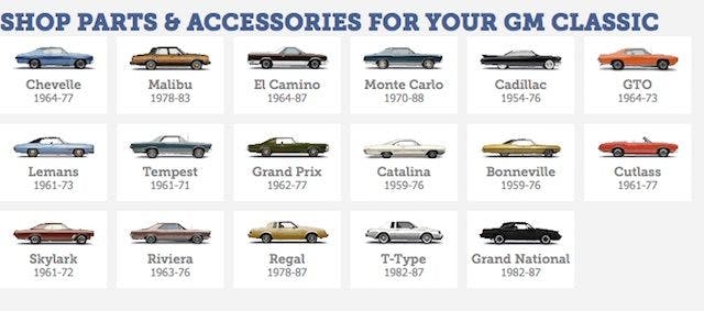 We did a pretty thorough search through the Cadillac parts offered by OPG and surprisingly found that almost anything you could want to restore a ’54-’76 Caddy could be found on the site. That’s all find and dandy if you are a Caddy fan, but what about other GM nameplates? No need to worry because OPG has you covered there too. From the ever popular Chevelle, Malibu, and El Camanos, to the Tempest, Skylark, and Riveras! They’ve even recently added the 1982-1987 Grand Nationals restoration parts in their product lines.