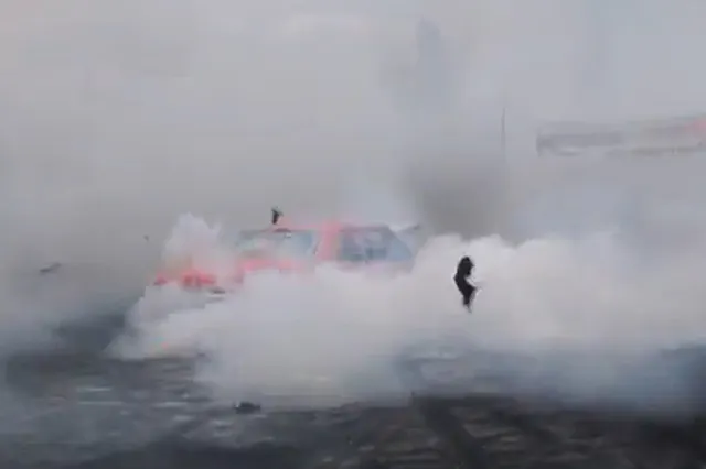 His second burnout starts the same: with the intent to fill the area with smoke, nothing less. But right from the start, fire erupts and the entire staging area is filled with flames. And yet he keeps going. After a short check to make sure all is okay, he doesn’t even wait for the safety worker to get out of the way and he’s already at it again, while the fire crew is busy putting out the fire behind him.