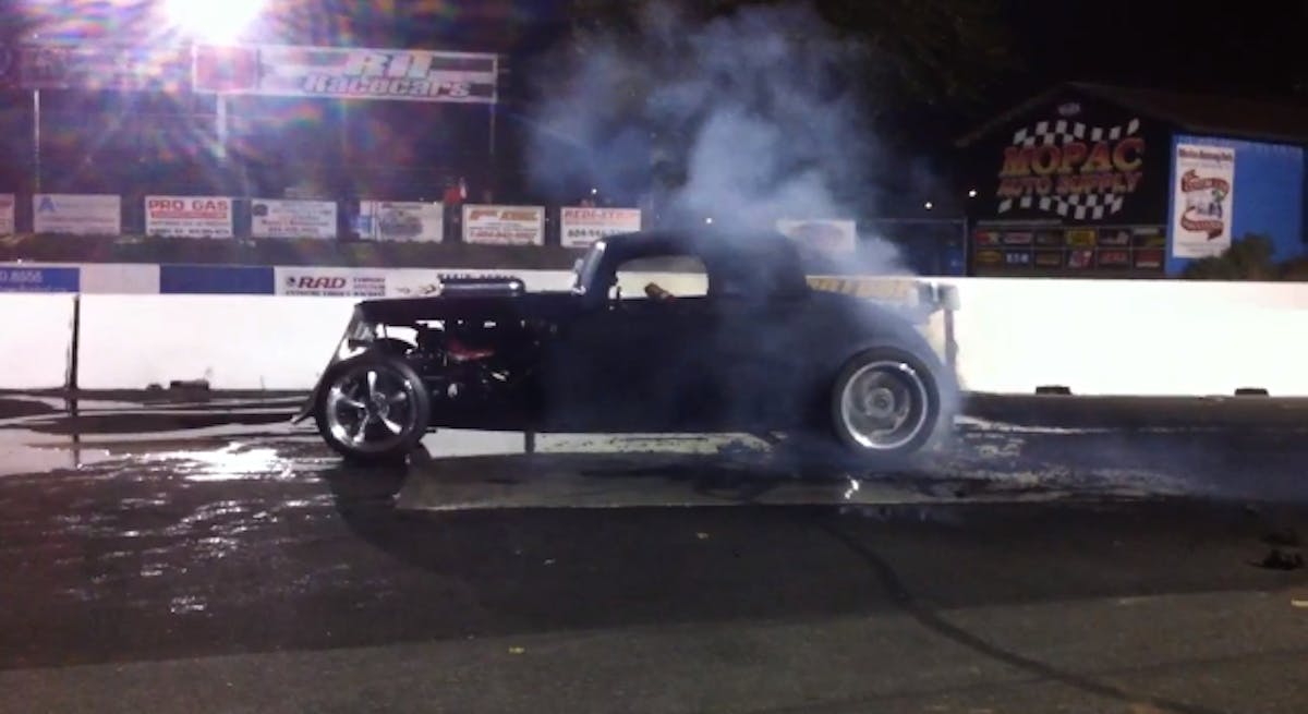 The car belongs to Mark Fettback from Langley, BC. Fettback’s suede black ’33 features a small-block Ford engine and is wearing Mustang Bullit replica wheels. The car is capable of dipping deep into the 12s at the drag strip, running a best of 12.28 at 109 mph. In this video he is participating in the track burnout contest.