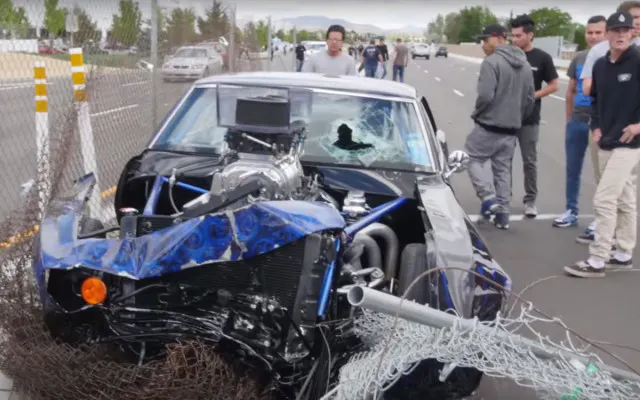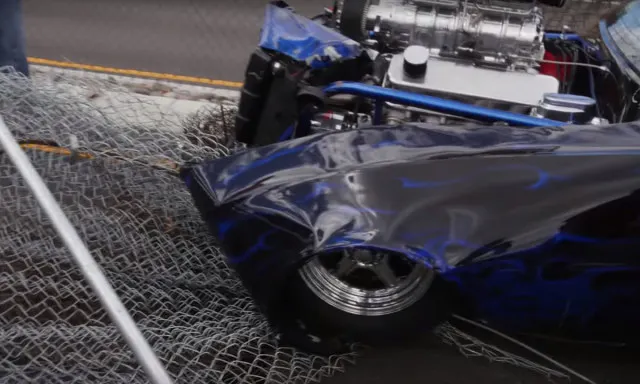 Unfortunately he didn’t quite have the Camaro straightened all the way out before sticking his foot into the blower. The car hooked left into the center divider and into the oncoming traffic lane, collecting a chain-link fence along the way. High horsepower and big meats are great for moving a lightened car when they hook up. Sometimes all that horsepower and traction can push in directions you weren’t prepared for.