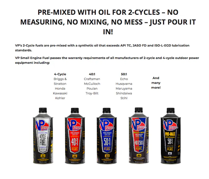 Levity aside, VP makes a variety of Small Engine Fuels that include the 4-Cycle Fuel used in the video, 2-Cycle 40:1, 50:1, Fix-It Fuel, Multi-Mix 2-Cycle 40:1/50:1, and ProMax 2-Cycle 50:1 (97 Octane). As you can imagine, each of them provides a host of features and benefits to the user.