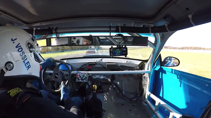 A peaky single turbo might not seem ideal for a road course, but this Mustang’s been retrofitted with a 2003 Cobra’s independent rear suspension—this one complete with 4.10 gears and a Ford Trac-Lock differential. Traction is supreme. Though the car may need some rebound tuning since it has a habit of letting go over crests (2:47 above), its snappy delivery is typically harnessed with the abundant rear grip available. For proof of this claim, note in the footage below how he’s able to match a well-driven Porsche Cayman out of slower bends at Englishtown.